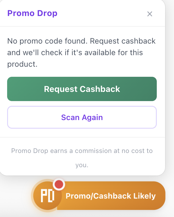 When no promo code is available for a product, Promo Drop checks if the product is eligible for cashback. If it is, you can claim it with one click. Cashback is paid directly to your Whop balance after a short processing period.