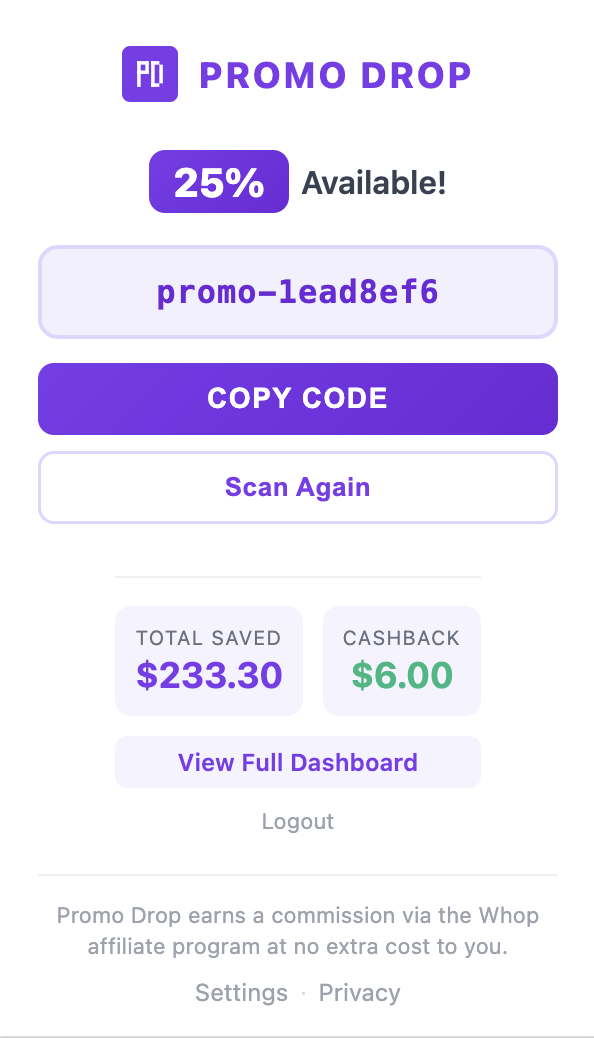 When you use a promo code or claim cashback, an affiliate parameter is added to your Whop URL. This earns Promo Drop a small commission through the Whop affiliate program — at absolutely no extra cost to you.