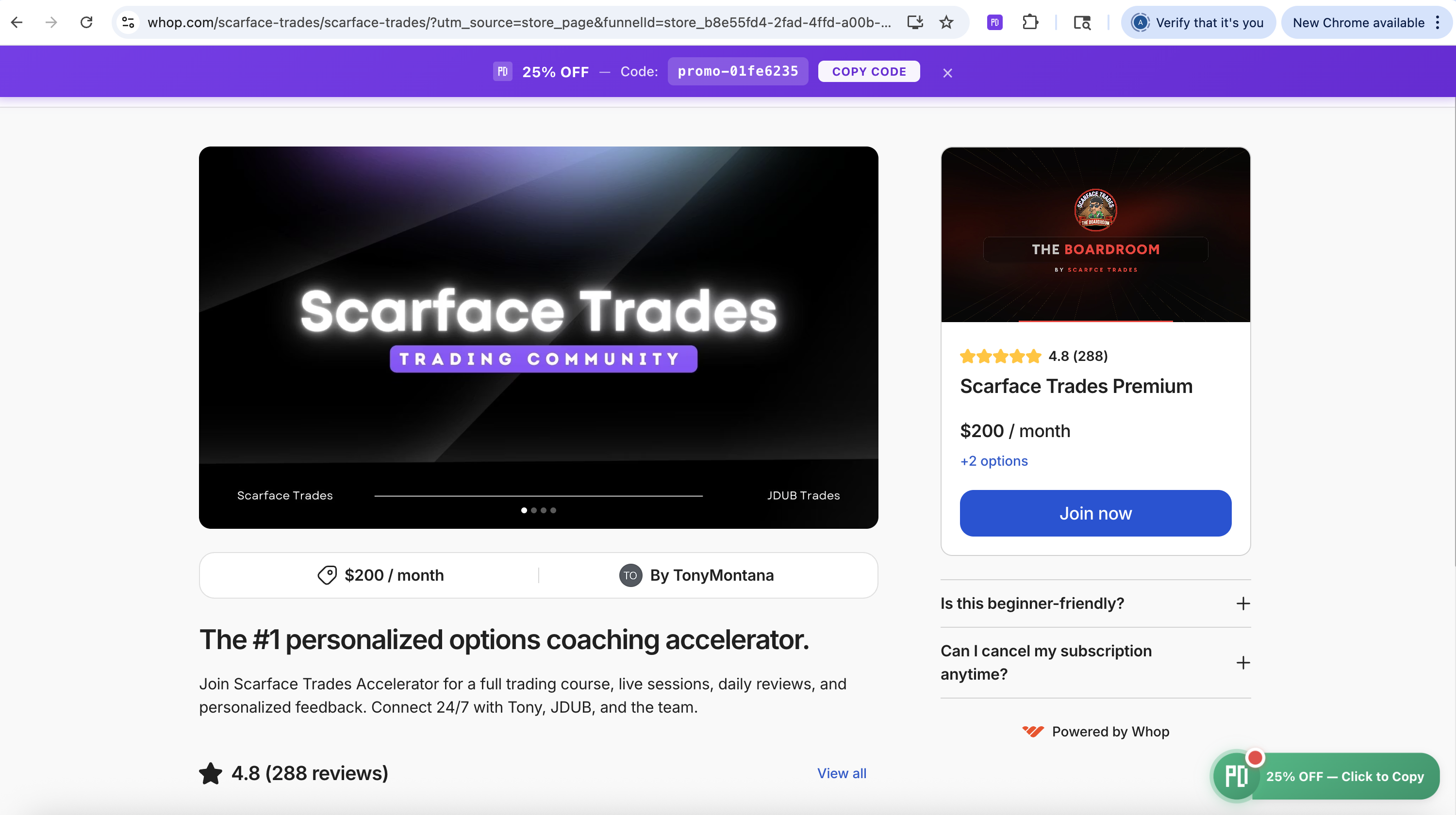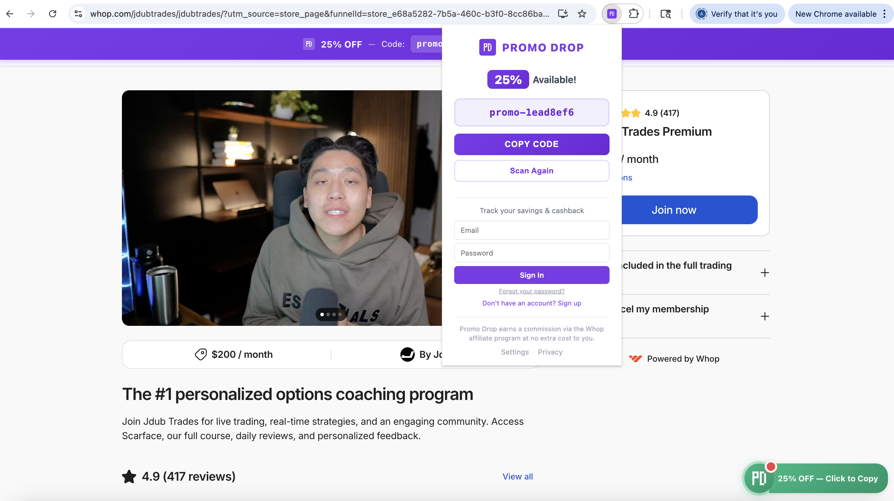 Here's what Promo Drop looks like in action on a real Whop product page.